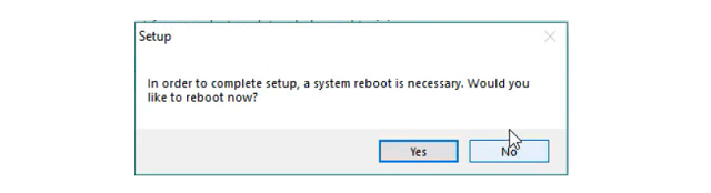 - Bước 7: sẽ có một cửa sổ Setup hiện lên và yêu cầu người chơi lựa chọn việc khởi động lại máy tính hay không, nếu muốn tiết kiệm thời gian thì hãy nhấn vào No.